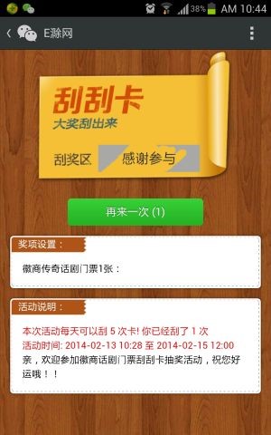 活動主題:關注E滁州微信,發(fā)送關鍵字“刮刮卡”,即可收到《徽商傳奇》門票刮刮卡刮獎頁面