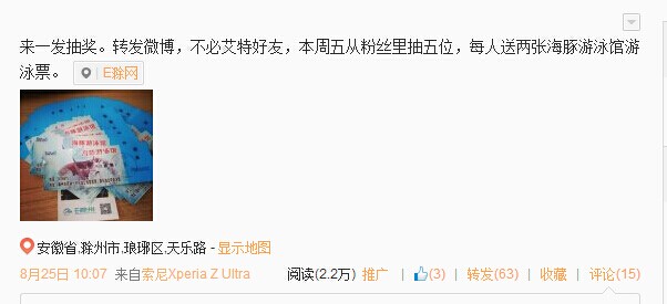 活動(dòng)概述:利用微博傳播速度快參與方式簡便以及互動(dòng)性強(qiáng)的特點(diǎn)開展了轉(zhuǎn)發(fā)送游泳票的活動(dòng)。參與方式非常簡便,只需關(guān)注我們的官方微博,再轉(zhuǎn)發(fā)發(fā)布的信息便有機(jī)會(huì)獲得游泳票;抽獎(jiǎng)方式利用新浪微博自帶的抽獎(jiǎng)系統(tǒng),公平公正無爭議。