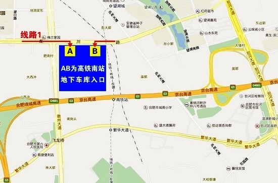 1.不管你從哪個方向來,都請繞行到龍川路。因為南站唯一一處地下停車場兩個入口均在龍川路上。龍川路上分別有社會車輛A、B兩個入口:A入口在徽州大道與龍川路交口東南角,當您通過這個路口拐上龍川路,看到路南面有個大大的“P”字時,A入口就到了;如果您錯過了這個入口,再沿龍川路向東開,在龍川路與仙人石路交叉口處,就是B入口。