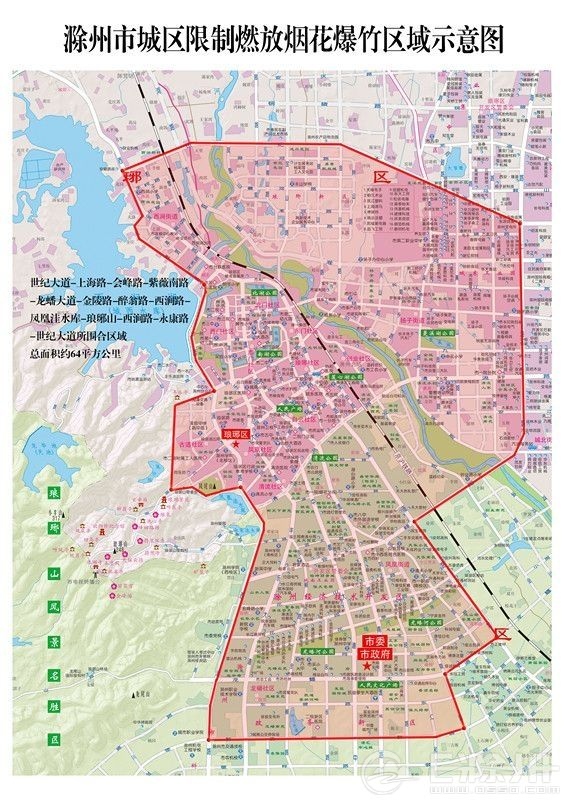 城區(qū)限制燃放煙花爆竹區(qū)域?yàn)椋骸笆兰o(jì)大道—上海路—會峰路—紫薇南路—龍?bào)创蟮馈鹆曷贰砦搪贰鳚韭贰P凰洼水庫—瑯琊山—西澗路—永康路—世紀(jì)大道”所合圍區(qū)域。